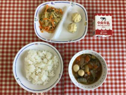 今日の給食は、『ごはん、八宝菜、バンサンスー、ショウロンポウ、牛乳』です。