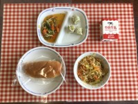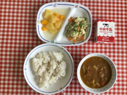 今日の給食は、『麦ごはん、カレーライス、チキンサラダ、ミックスフルーツ、牛乳』です。