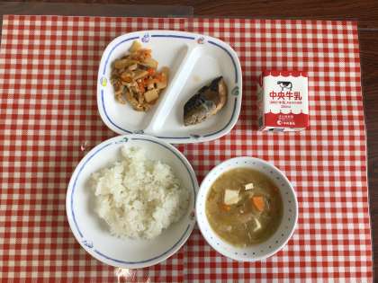 今日の給食は、『ごはん、麦みそ汁、たけのこごはん、さばの煮つけ、牛乳』です。