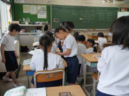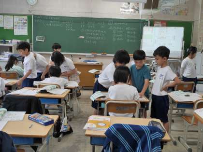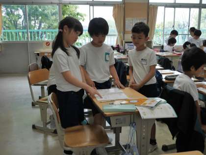 ミニティーチャーの子たちが友達にアドバイスして学び合っていました。