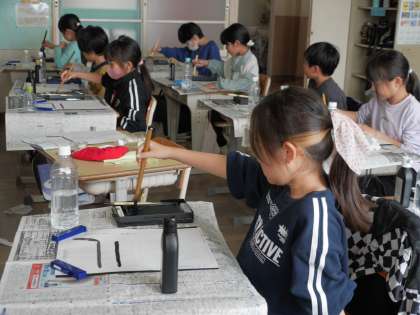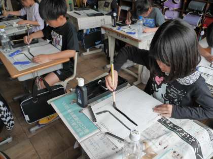 初めての毛筆。筆の持ち方や墨のつけ方から一歩一歩学びました。