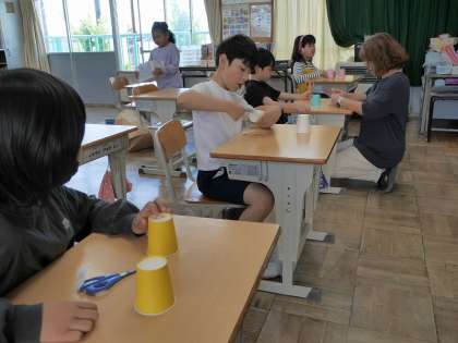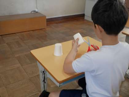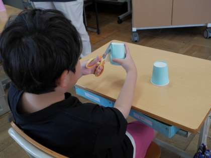 紙コップを切って工作をしていました。