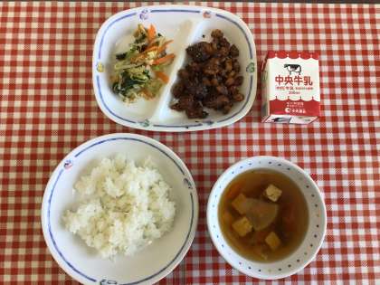 今日の給食は、『ごはん、けんちん汁、おひたし、レバーと大豆のみそがらめ、牛乳』です。