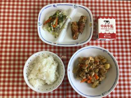 今日の給食は、『ごはん、高野豆腐のうま煮、ゆかりあえ、ちくわのお茶揚げ、牛乳』です。