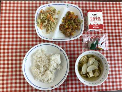 今日の給食は、『麦ごはん、若竹汁、とり肉とごぼうのサラダ、かつおのそぼろ丼、かしわもち、牛乳』です。