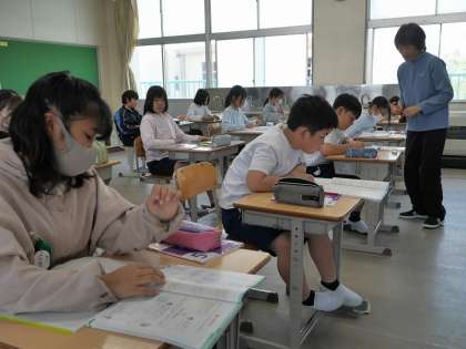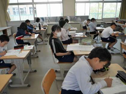 少人数に分かれて、立体の体積を求める練習問題に取り組んでいました。