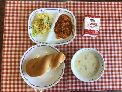 今日の給食は、『ツイストパン、ポタージュスープ、サワーキャベツ、とり肉のトマト煮込み、牛乳』です。
