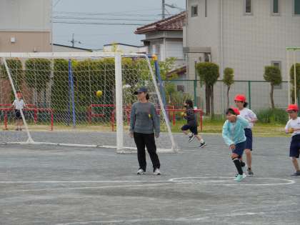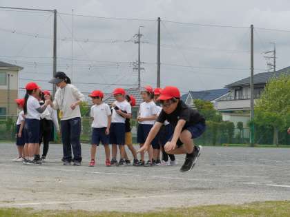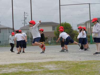 学年合同で体力テストの練習を行いました。 ソフトボール投げと立ち幅跳びを行いました。