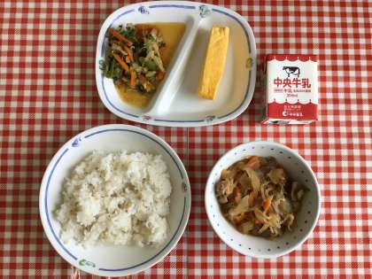 今日の給食は、『麦ごはん、豚丼、おかかあえ、厚焼き卵、牛乳』です。