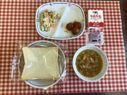 今日の給食は、『スライスパン、オニオンスープ、ビーンズサラダ、ミートボール、いちごジャム、牛乳』です。
