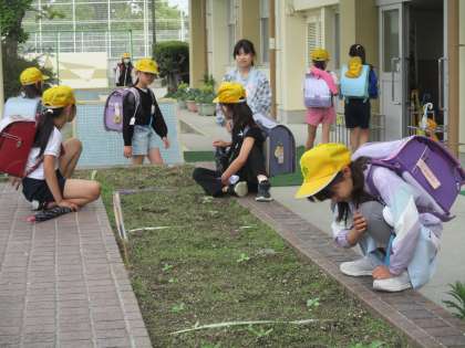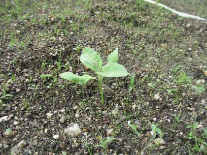 3年生が植えたヒマワリ、ホウセンカ、オクラが目を出して伸び始めました。