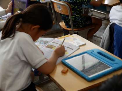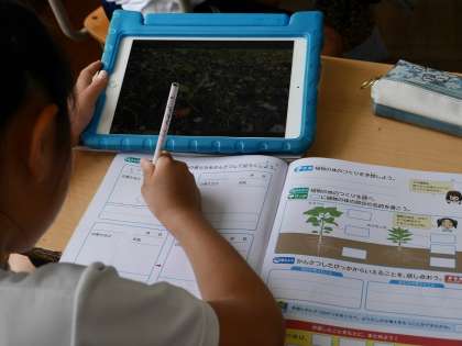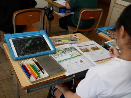 ホウセンカやヒマワリの生長の様子を学習用タブレットで撮影し、観察記録に書き写しました。