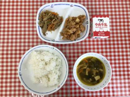今日の給食は、『ごはん、わかめスープ、野菜たっぷり糸こんチャプチェ、とり肉の香味ソースかけ、牛乳』です。