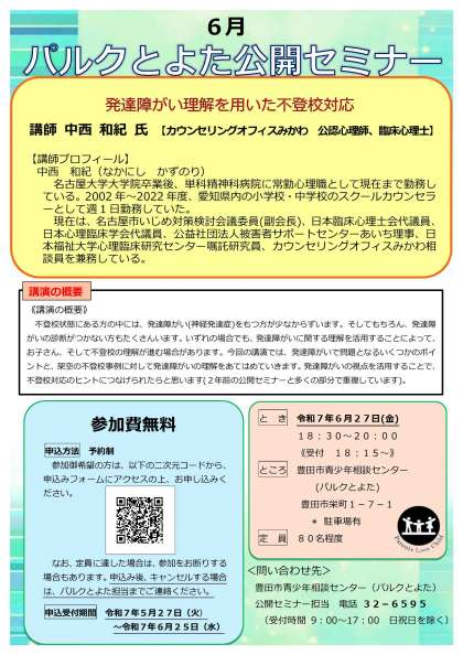 令和7年6月27日(金)18時半からパルクとよたにて、6月パルクとよた公開セミナーを開催します。
