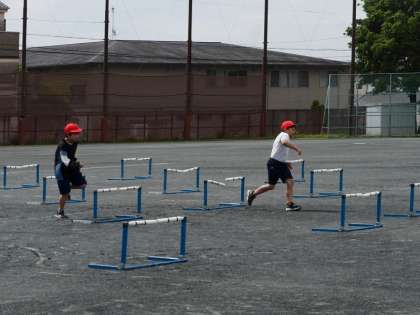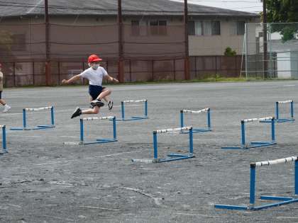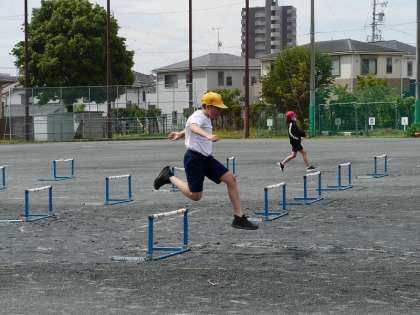 ハードル走を行いました。 タイムを計測しながらどうすれば速く走れるかを考えていました。