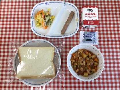 今日の給食は、『スライスパン、ポークビーンズ、サワーキャベツ、ウインナー、ブルーベリージャム、牛乳』です。