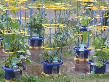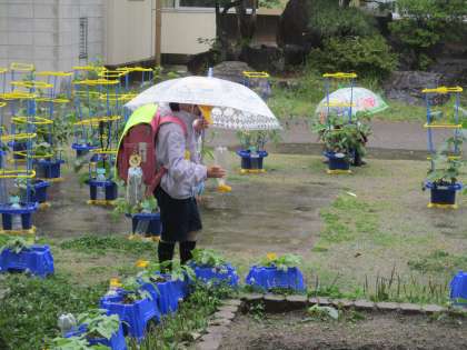 雨でも水やりをする一年生。アサガオ愛がすばらしいですね。