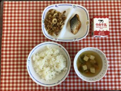 今日の給食は、『ごはん、すまし汁、切干し大根のソース炒め、さばの塩焼き、牛乳』です。