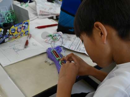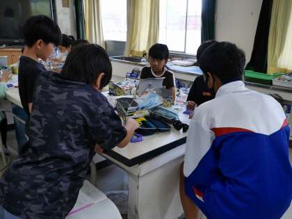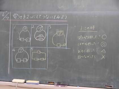 電池のつなぎ方によるプロペラのまわり方の違いを実験していました。