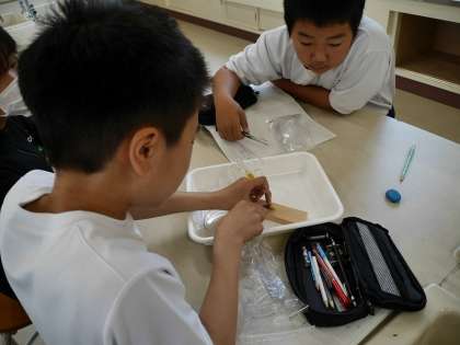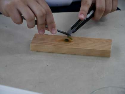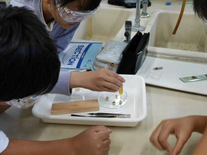 大豆の種子と子葉を半分に切り、ヨウ素液をたらします。