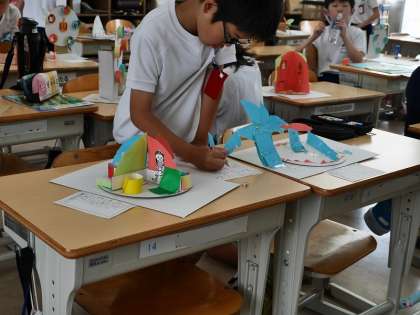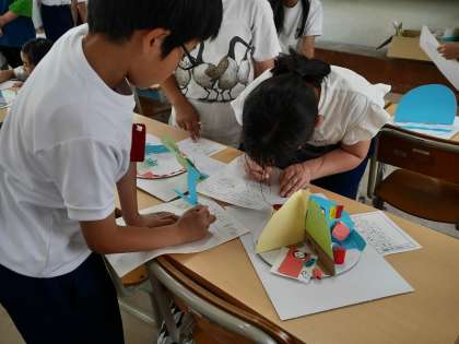 今日は友達の作品を見て回り、感想カードを書いて交流しました。