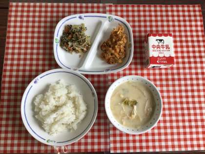 今日の給食は、『ごはん、豆乳バランスみそ汁、のり酢あえ、わんぱくじゃこ天、牛乳』です。