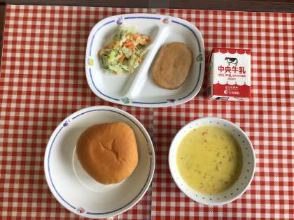 今日の給食は、『サンドイッチバンズ、コーンチャウダー、アーモンドサラダ、ハムバーガー、牛乳』です。