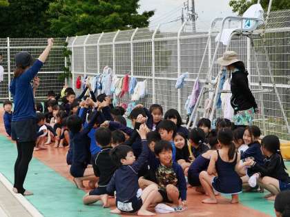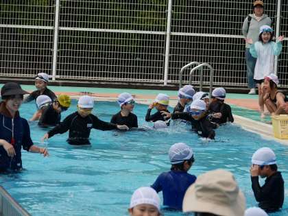 1年ぶりの水泳は、バディの確認の仕方など安全指導から始めました。