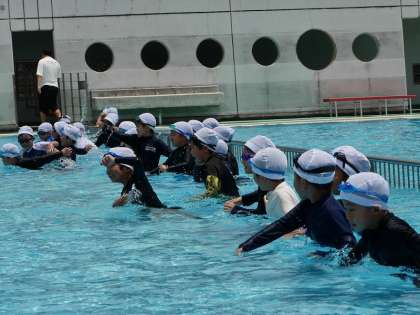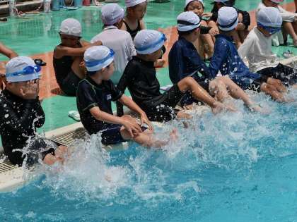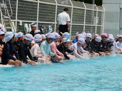 初めての学校のプール。 まずは安全指導から水に慣れる活動へ。 みんな楽しそうです。