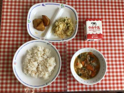 今日の給食は、『麦ごはん、中華飯、華風あえ、大学いも、牛乳』です。