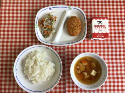今日の給食は、『ごはん、かしわ汁、ゆかりあえ、かつおのミンチカツ、牛乳』です。