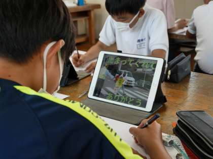 下書きの前に学習用タブレットで、素材の画像や文字を配置してデザインを決めてから画用紙に描いていました。