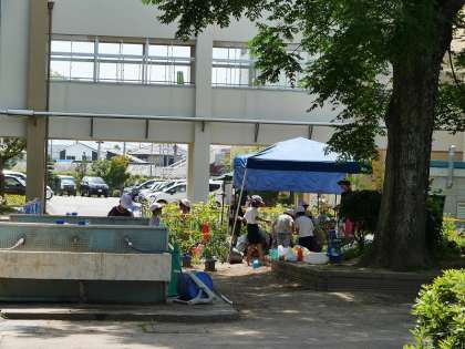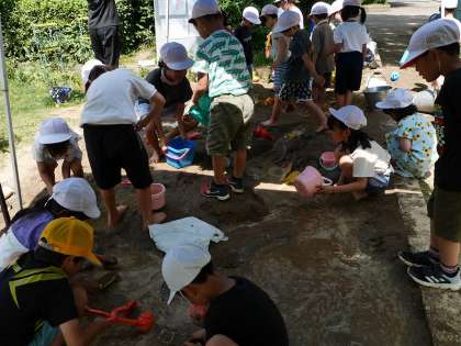 砂場で泥遊びに夢中です。 服が泥んこになった子もいます。ごめんなさい!