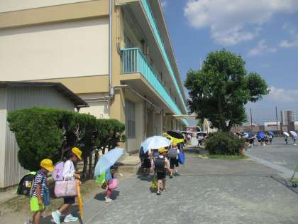 炎天下での待ち時間を減らすため、暑い時期は雨降り下校と同じ方法で学年下校します。