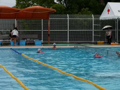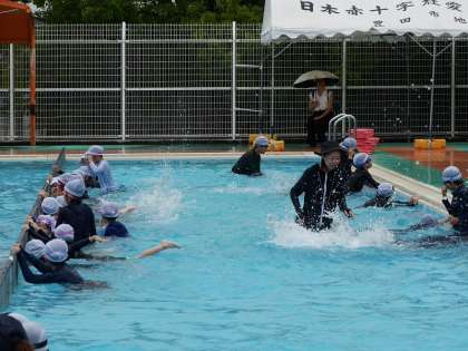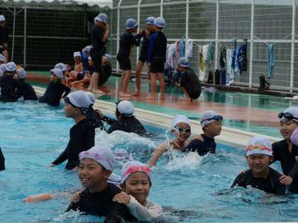 小雨の中の水泳授業でした。