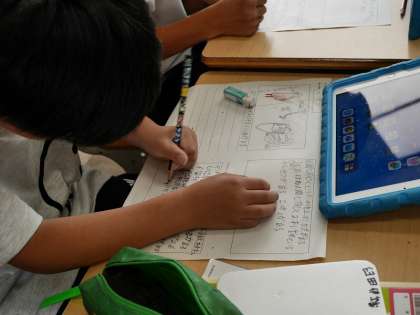 学習用タブレットで選んだ動物の骨格を調べてプリントにまとめていました。