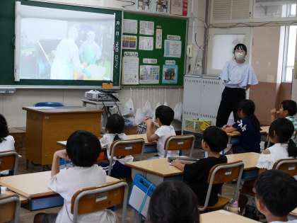 栄養教諭が「給食が届くまで」について指導しました。