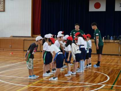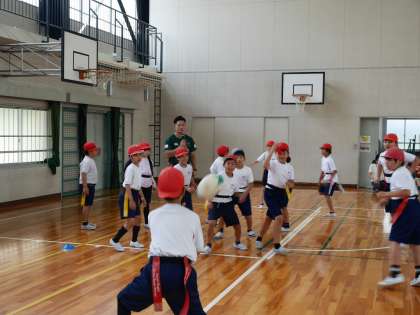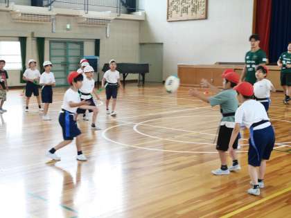 4年タグラグビー教室 公開日 2025/07/04 更新日 2025/07/04 各学年から トヨタ・ヴェルブリッツの3名の選手が来校。 子どもたちにタグラグビーを教えてくださいました。 ラグビーに興味をもったら豊田スタジアムに応援に行こう! 4年
