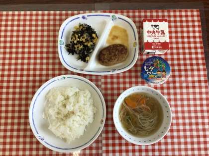 今日の給食は、『ごはん、天の川汁、七夕サラダ、ハンバーグのおろしソースかけ、星形パインゼリー、牛乳』です。