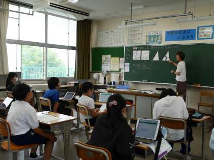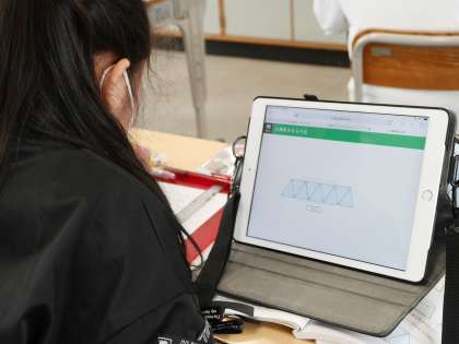 学習用タブレットで三角形を操作して、その特徴を見つけていました。
