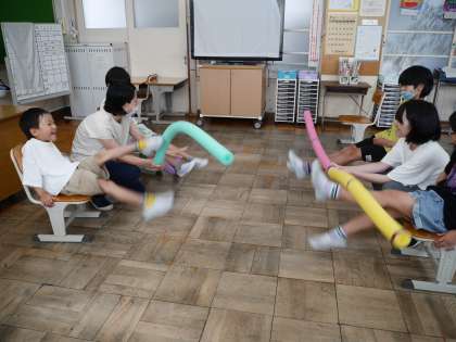 3組は足の甲でウレタンバーを蹴り上げる動きの練習をしていました。