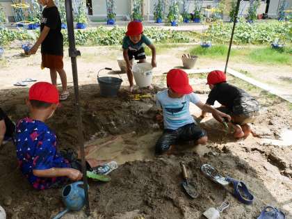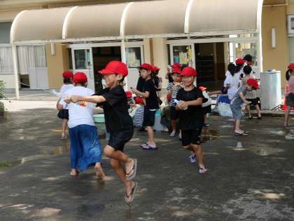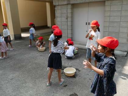 「なつとなかよし」最後の水遊びです。これまで体験した遊びを最後に存分に楽しみました。