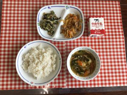 今日の給食は、『麦ごはん、五目スープ、海藻サラダ、キムチチャーハン、牛乳』です。