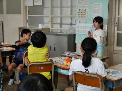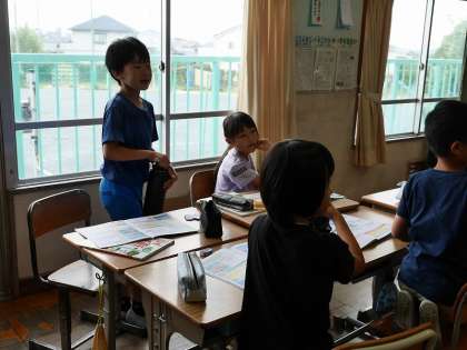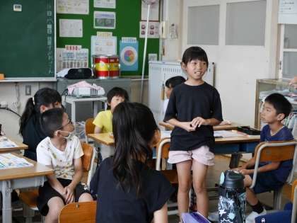 「音のふしぎ」太鼓をたたいたときに、太鼓の上に置いたビーズがどうなるか予想を立てていました。
