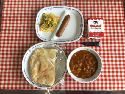 今日の給食は、『ナン、チキンカレー、フレンチサラダ、ウインナー、コーヒー牛乳の素、牛乳』です。