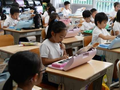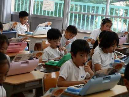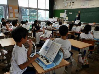 「ぷっかりくじら」を鍵盤ハーモニカで演奏する練習をしていました。