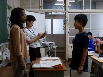 「Can you〜?」の受け答えのスピーキングテストをしていました。