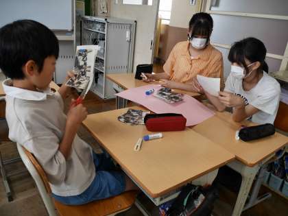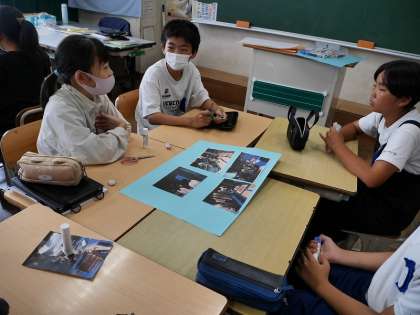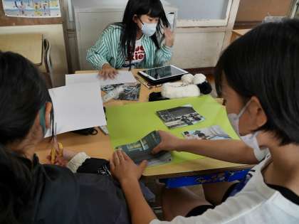 写真を使った学級の歩みの掲示物を、グループで分担して作りました。