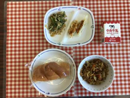 今日の給食は、『米粉パン、焼きそば、ナムル、ぎょうざ、牛乳』です。