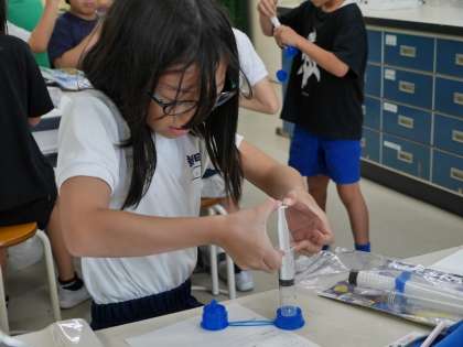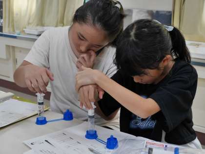 「空気は縮むのか」についてピストン実験器具を使って確かめていました。